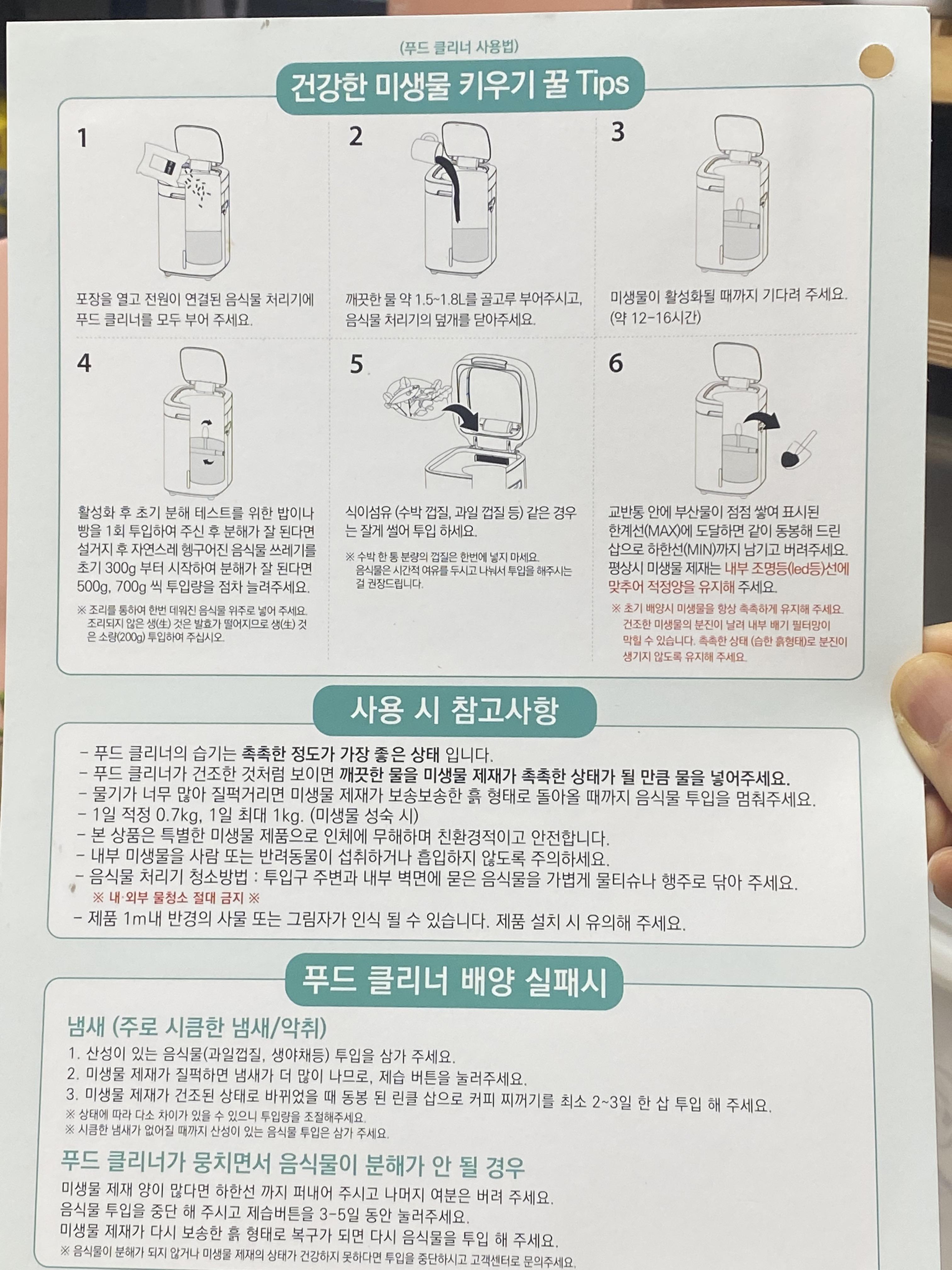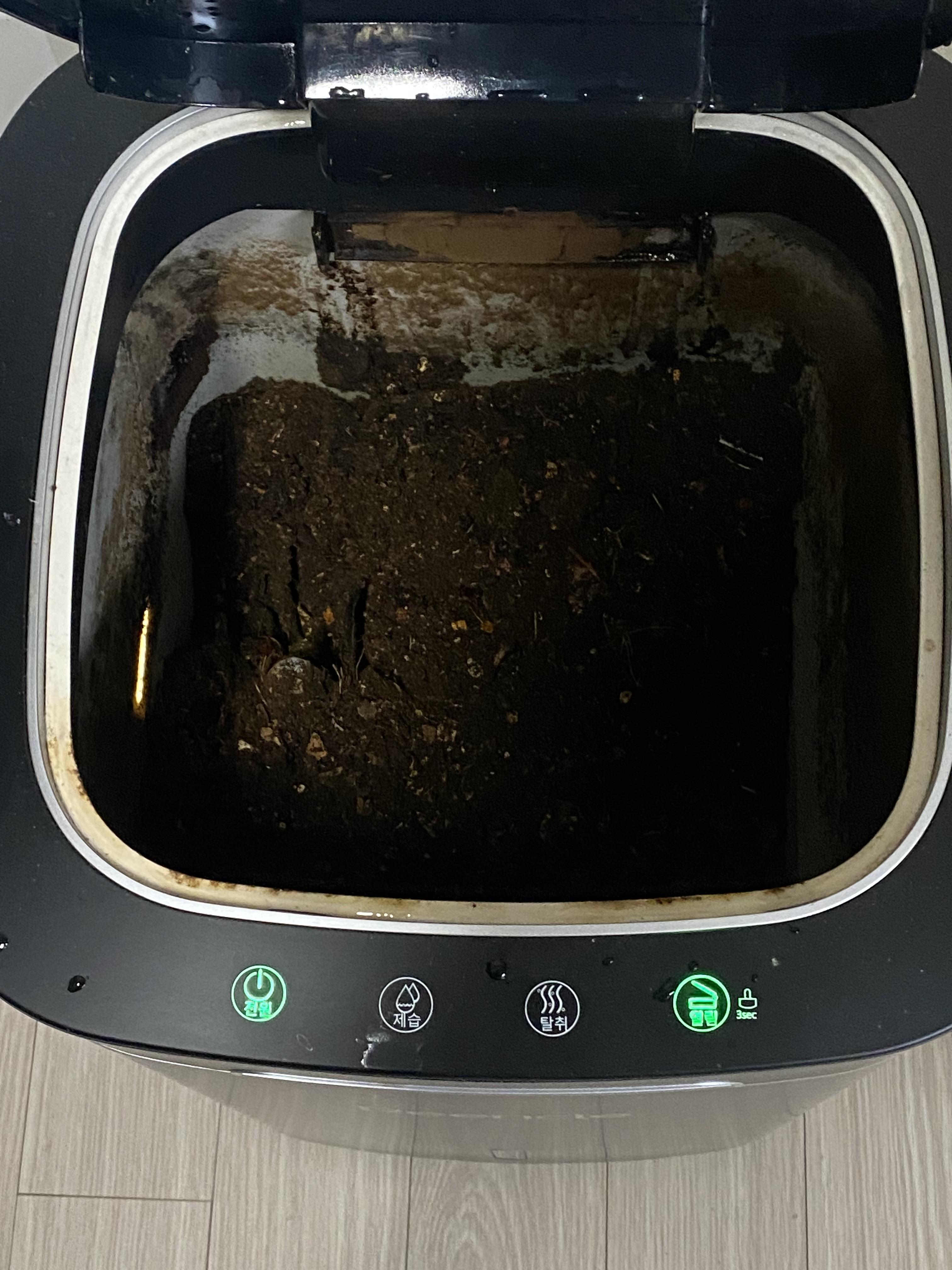 이 때 내부배기필터망을 세척하고 며칠간 음식물 투입을 중지한 뒤 탈취와 제습기능으로 관리하여 해결했다.