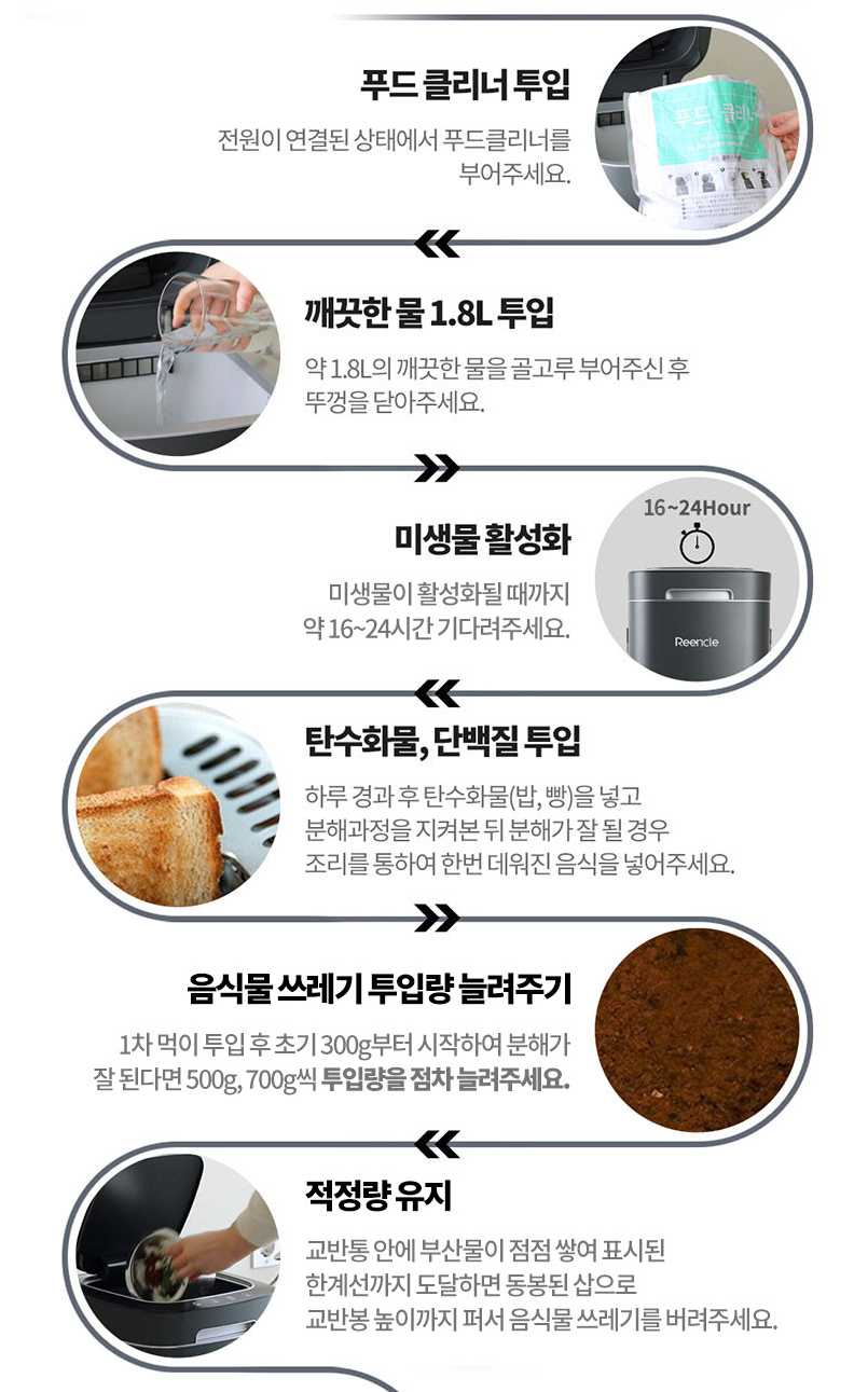 4) 초기 300g 부터 시작해 점차적으로 음식물 투입량을 늘린다.