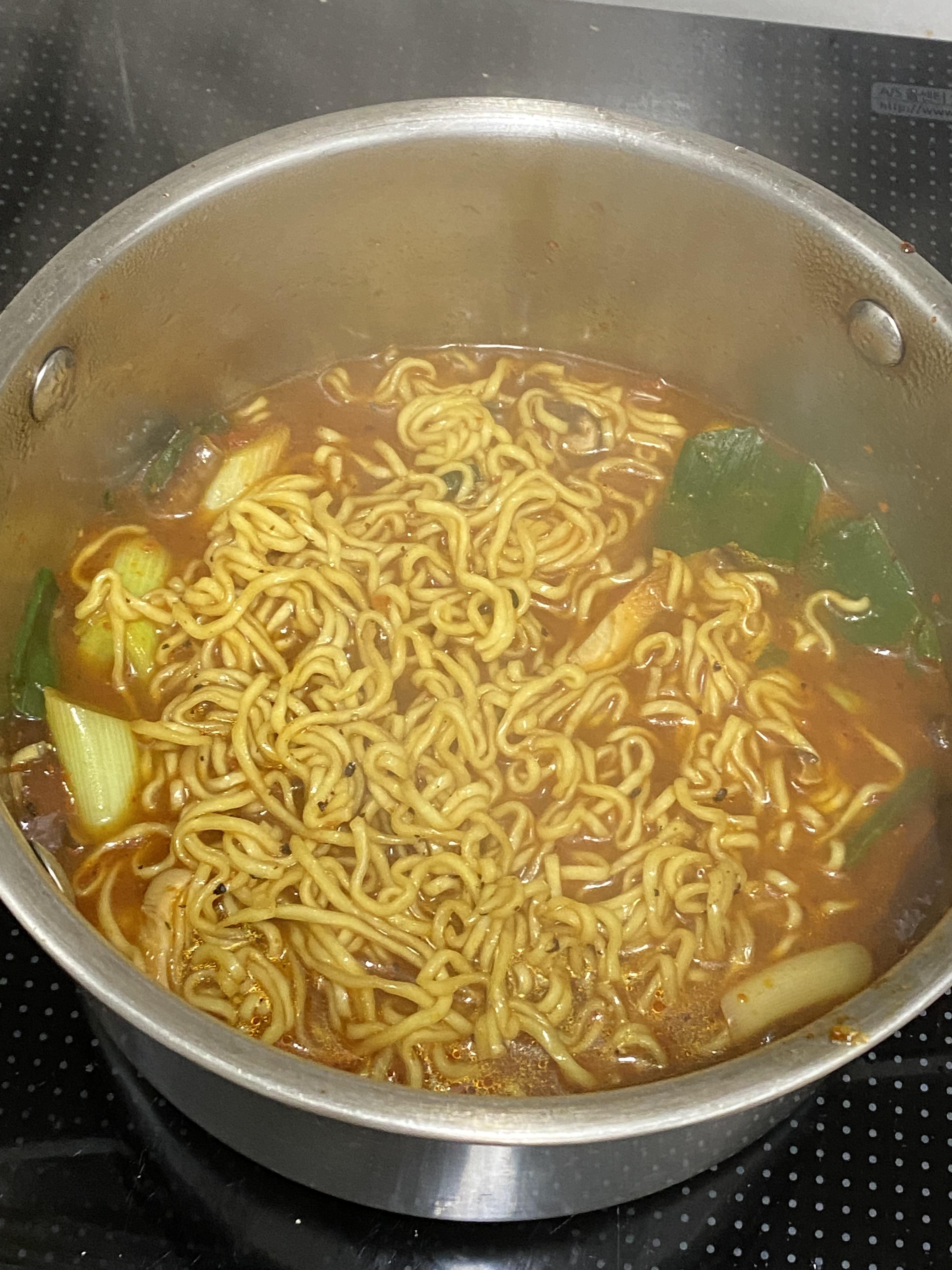 6. 면을 넣고 익힌다. 신라면 건면은 끓는 물에 2분 정도면 면이 꼬들하게 익을 정도가 된다.
