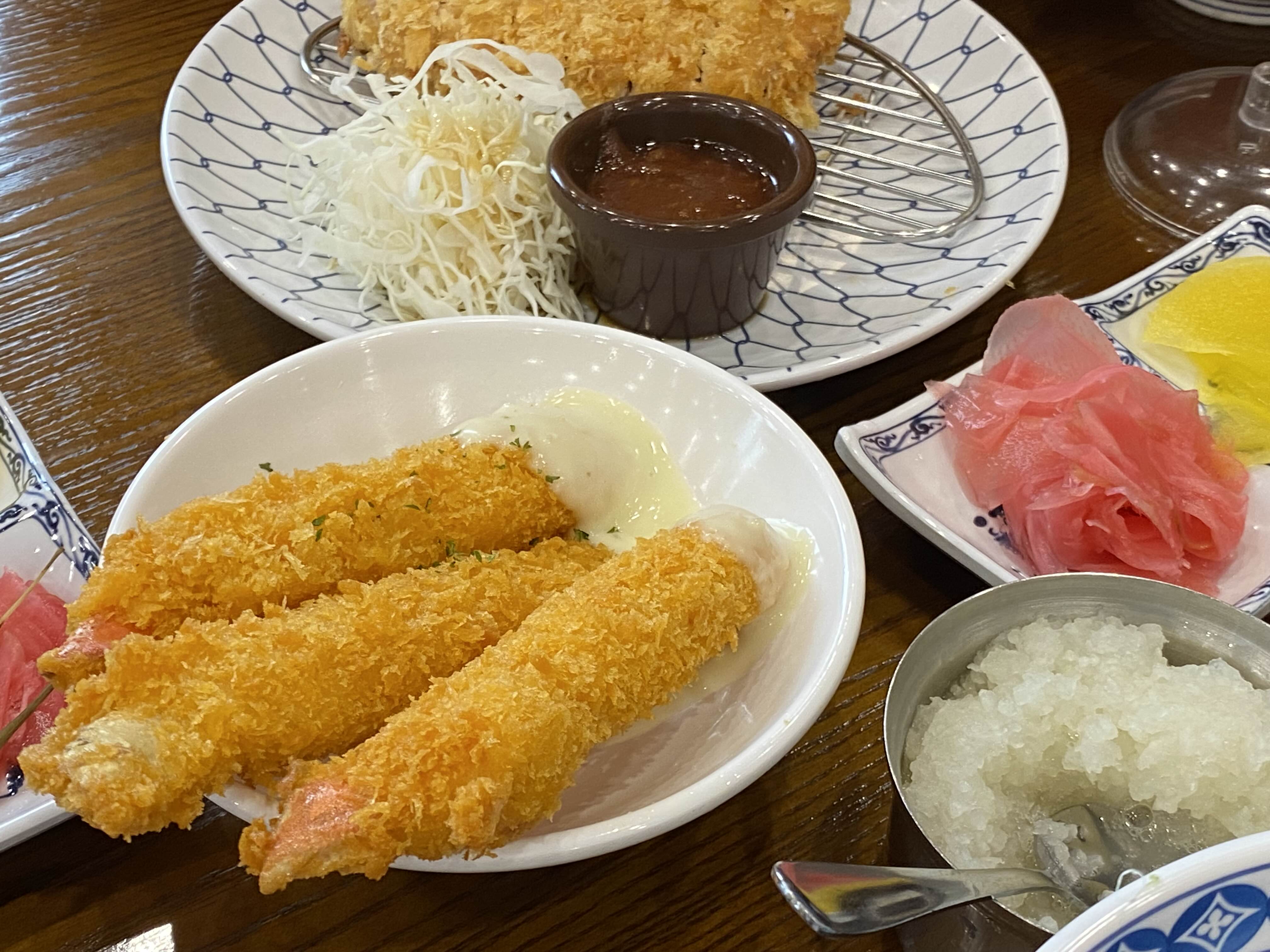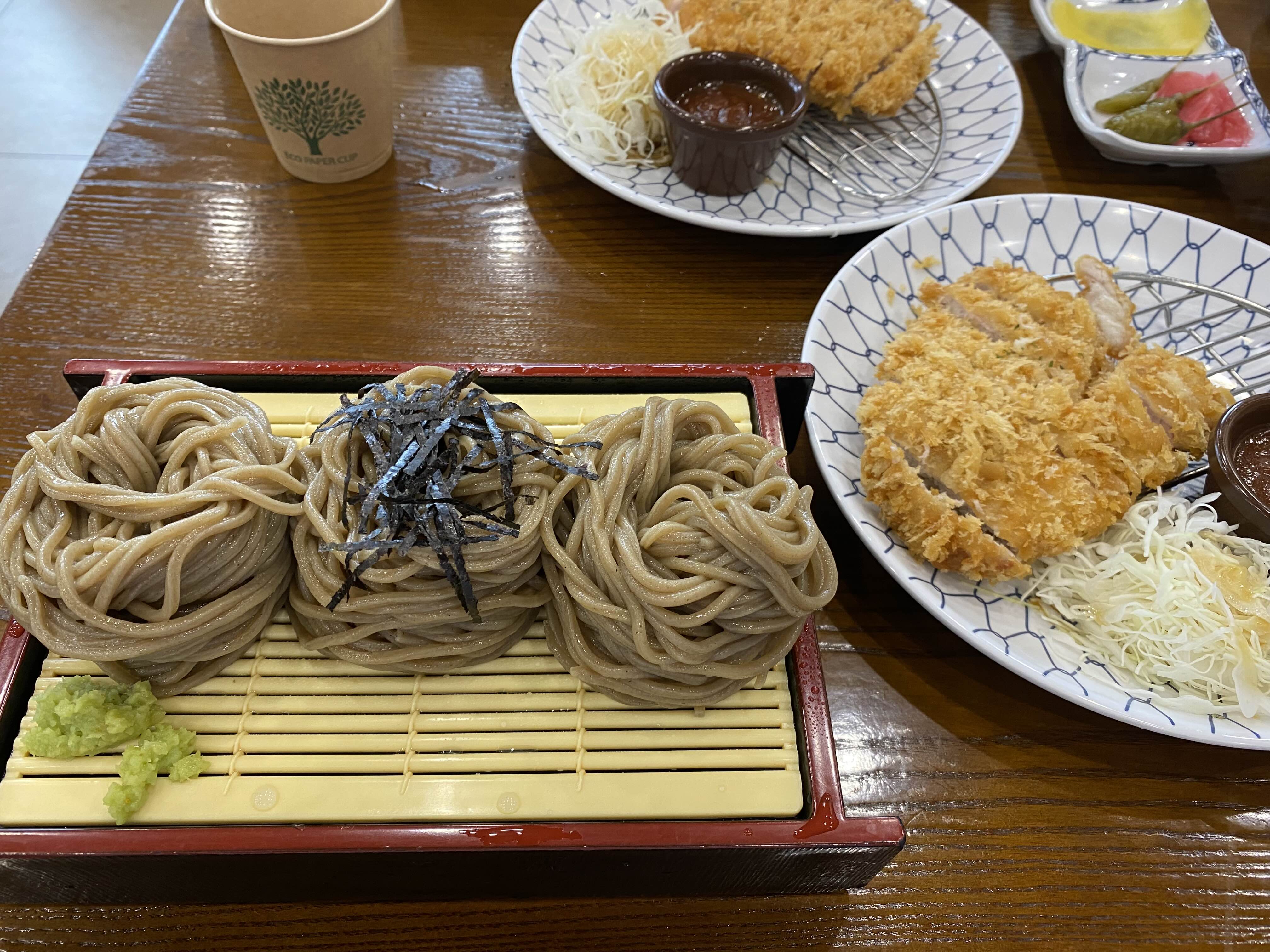 우리는 삼동정식(냉소바+돈까스) 3개와 비빔소바정식(비빔소바+돈까스), 게다가 리뷰이벤트로 대게튀김도 함께 주문했다.