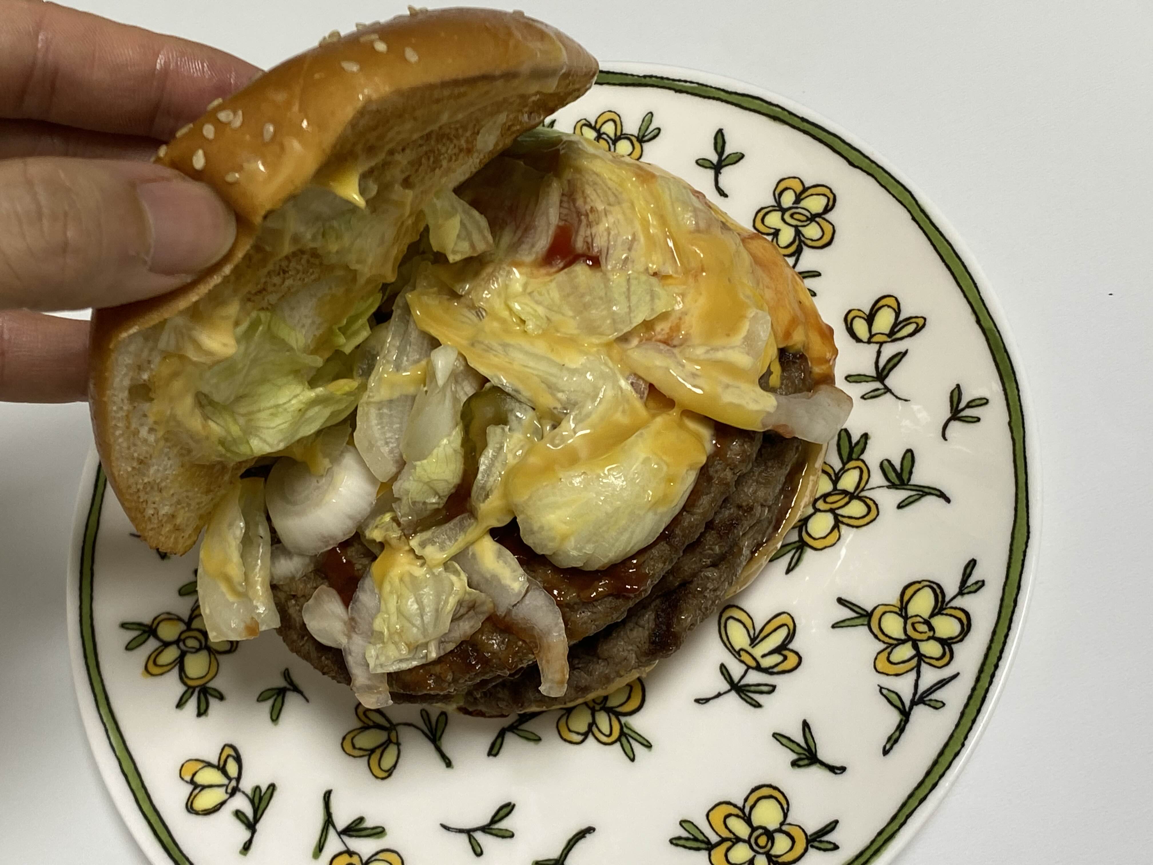 버거 상단에 어느 정도의 양상추와 양파가 있고 더오치 맥시멈 단면을 잘라보면 이게 '고기버거'지 하는 느낌이 강렬하게 온다.